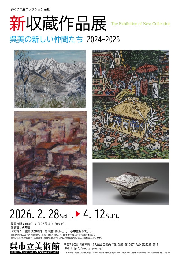 Since its opening in 1982¡¤ Kure Municipal Museum of Art has collected a wide variety of artworks by artists connected with Kure¡¤ as well as Japanese and overseas artists. This exhibition presents newly acquired works from 2024 to 2025 alongside our existing collection.